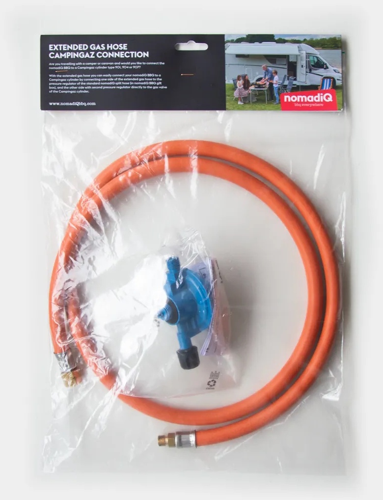 Möchten Sie den nomadiQ BBQ auch an eine Campingaz Gasflasche Typ 901, 904 oder 907 anschliessen können? Dann nutzen Sie diesen speziell entwickelten Gas-Verlängerungsschlauch mit extra 30 Mbar Druckverteiler, der bis zu 15 Bar Druck aushält.