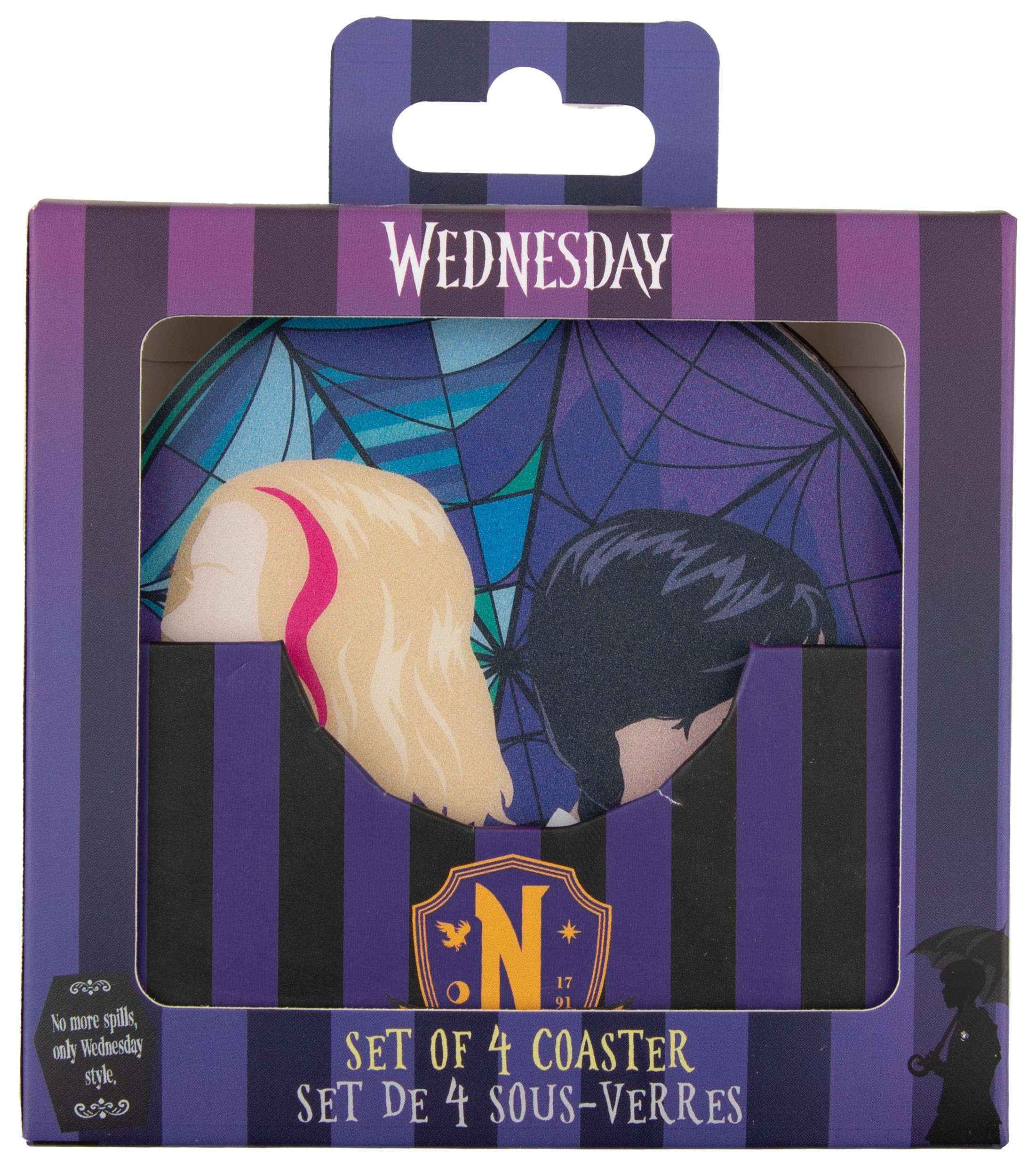 Ce set contient quatre sous-verres magnifiquement conçus avec des motifs cultes de la série populaire, comme Enid et Wednesday, Wednesday jouant du violoncelle, le logo de la Nevermore Academy et enfin Goody et Wednesday ensemble.